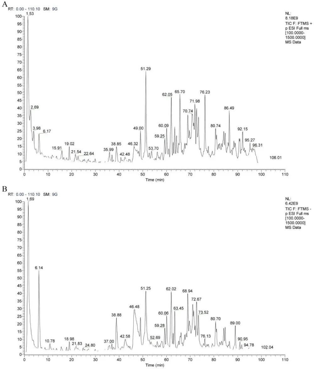 UPLC-MS/MS analysis was performed on a DioneUltiMate 3000 system coupled to a Thermo Q-Exactive Plus mass spectrometer to determine the chemical constituents of GSNS, according to a published method [20]. Chromatographic separation utilized an ACQUITY UPLC HSS T3 column (1502.1 mm, 1.8 µm). The mobile phase consisted of (A) deionised water containing 0.1% formic acid and (B) acetonitrile containing 0.1% formic acid. These were delivered in gradient elution mode as follows: 0 - 5 min: 5% B; 5 - 95 min: 5% to 95% B (linear gradient); 95 - 100 min: 95% B. Thereafter, the system was returned to the initial conditions (95% A, 5% B) within 0.1 min, after which it was equilibrated for 10 min. A constant flow rate of 0.3 mL/min was maintained throughout the run. Data acquisition and processing were carried out using Xcalibur and TraceFinder 5.1 software (Thermo Fisher Scientific, Waltham, MA, USA).