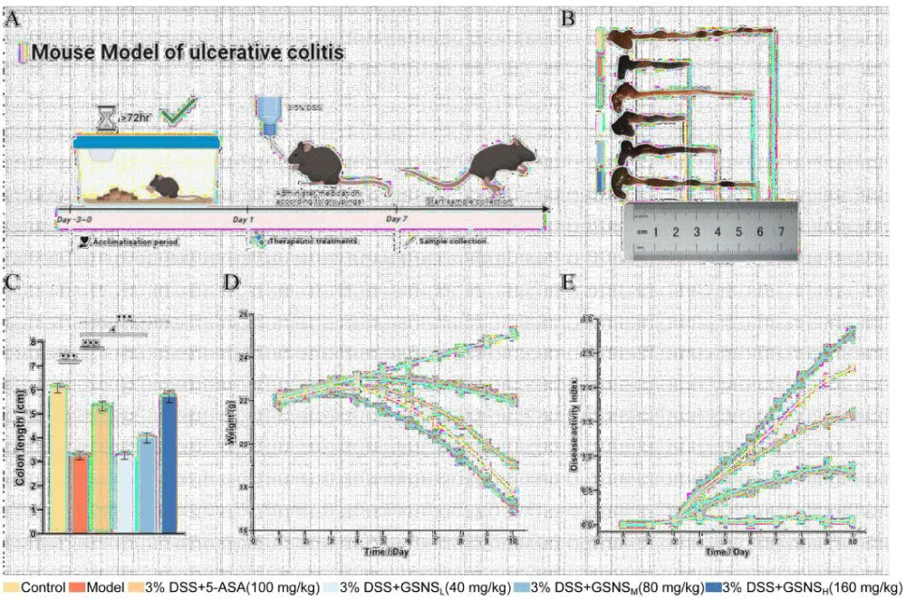 Male C57BL/6J mice weighing 20 ± 2 g were obtained from Speifu (Beijing) Biotechnology Co., Ltd. (Changchun, China; licence no. SYXK (Ji) 2021-0003). After a three-day acclimatisation period under controlled conditions (25 ± 2℃, 60 ± 5% relative humidity, 12 h light/dark cycle), the mice were randomly divided into six groups (n = 6). The control group received normal drinking water. The model group received 3.5% (w/v) DSS in drinking water for 7 days. The positive control group received 3.5% DSS water plus 5-ASA (100 mg/kg/day) by oral gavage. Three treatment groups (GSNSL, GSNSM, GSNSH) received 3.5% DSS water plus GSNS at doses of 40, 80, and 160 mg/kg/day, respectively, via oral gavage. Drug administration (5-ASA and GSNS) was performed daily from day 4 to day 10. On day 11, all mice were euthanised. Peripheral blood was collected via orbital bleeding, and colon tissues as well as intestinal contents were immediately harvested for subsequent analysis (see experimental timeline in Figure 2). Animal experiments used six mice per group (n = 6) based on pilot study effect sizes for sufficient statistical power. For molecular analyses (Western blot, qPCR), three randomly selected samples per group (n = 3) served as biological replicates, sufficient to validate in vivo mechanisms. This design follows the Reduction principle of the 3R framework (Replacement, Reduction, Refinement), minimizing animal use while maintaining data reliability [21]. All assays included three technical replicates. All procedures were approved by the Animal Care and Use Committee of the School of Pharmacy, Jilin University (Approval No. 20250121) and conducted in accordance with relevant guidelines.