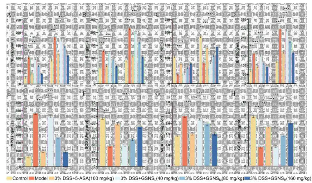 We confirmed the successful induction of the UC model based on a significant rise in pivotal pro-inflammatory cytokines [31]. As illustrated in Figures 3A - D, DSS induction resulted in a substantial increase (p < 0.001) in TNF-α, IL-6, and IL-1β levels in both serum and colon tissue. It also altered IL-10 expression, an anti-inflammatory cytokine. Administration of GSNS and 5-ASA significantly reversed these aberrant cytokine profiles (p < 0.05, p < 0.01, or p < 0.001). The suppressive effect of GSNS on pro-inflammatory cytokines was dose-dependent, with the high-dose group exhibiting efficacy comparable to the 5-ASA group. Furthermore, data on colonic oxidative stress markers (Figures 3E - H) showed that GSNS reduced MPO activity and MDA content in a dose-dependent manner, while enhancing SOD activity and GSH levels. This antioxidant effect was most pronounced at the GSNSH, equivalent to that achieved with 5-ASA treatment.