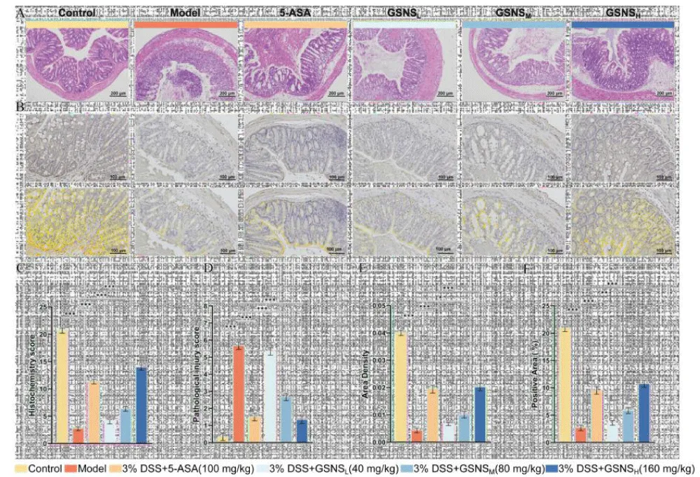 Colon tissue H&E staining results and pathological scores are shown in Figure 4A and C. The control group displayed preserved colonic architecture, characterized by an intact mucosal layer and regularly arranged glands. Inflammatory cells were only sporadically present in the lamina propria. In contrast, the model group displayed typical pathological features of severe UC: extensive mucosal epithelial defects, substantial depletion of goblet cells, destruction and loss of crypt architecture, severe submucosal oedema, and transmural infiltration by a large number of inflammatory cells (P < 0.001 vs. control group) [32]. GSNS treatment improved these pathological injuries in a dose-dependent manner. Compared with the model group, the GSNSM and GSNSH groups showed significantly reduced inflammatory infiltration and improved mucosal architecture (p < 0.001). Notably, the overall histopathological score in the GSNSH group was not significantly different from that in the 5-ASA group (p > 0.05), indicating a similar degree of improvement.