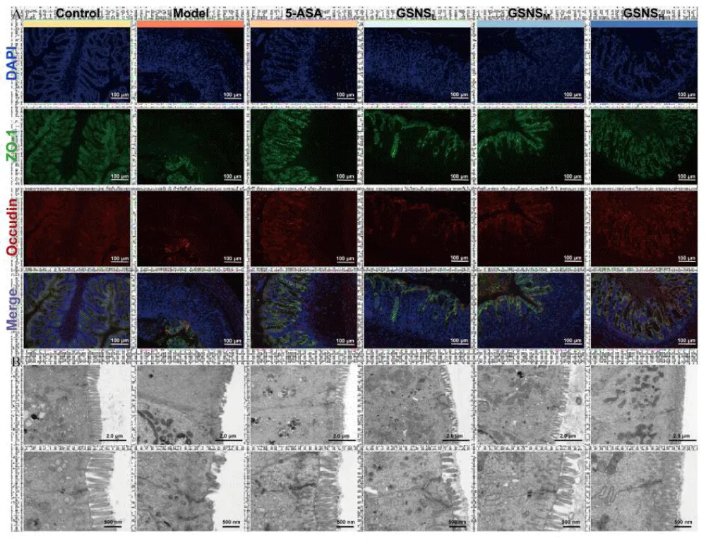 Representative transmission electron micrographs of colonic tissue are shown in Figure 5B. Examination by TEM revealed that control intestinal epithelial cells were characterized by dense, orderly microvilli, intact tight and gap junctions, and normal organelle structure. The DSS model group demonstrated severe ultrastructural damage: sparse or shed microvilli, widened intercellular spaces, blurred or absent tight junctions, and swollen, vacuolated mitochondria [37]. Following GSNS treatment, epithelial ultrastructure exhibited dose-dependent repair. In the GSNSH group, intestinal epithelial microvillus density, cell junction integrity, and organelle status all approached normal levels, comparable to the 5-ASA group.