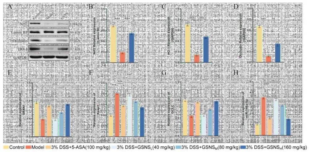 Western blot analysis results for protein expression are presented in Figure 6A, and corroborate the corresponding gene-level changes. A marked reduction was observed in the expression of Occludin, Nrf2, and its downstream effector HO-1 in the model group [38]. Following GSNS treatment, the protein expression levels of all three targets were significantly increased. Furthermore, the band intensity analysis histograms in Figure 6B - D revealed significant differences between the DSS model group and both the control group and the GSNSH group (p < 0.001). The RT-qPCR results shown in Figure 6E - H indicated that DSS-induced colitis significantly upregulated Keap1 mRNA and miR-146a-5p expression in colon tissue (p < 0.001), while suppressing the expression of the antioxidant gene GCLC and the transcription factor SXRN1. GSNS intervention reversed these abnormal expressions in a dose-dependent manner. In summary, this study demonstrates, at both transcriptional and translational levels, that GSNS alleviates colitis by inhibiting Keap1, promoting Nrf2 nuclear translocation, and subsequently upregulating downstream antioxidant protein HO-1 and barrier protein Occludin.