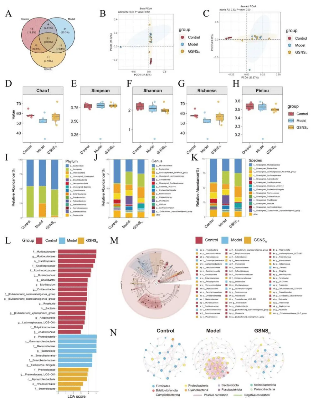 The effect of GSNS on the gut microbiota in DSS-colitis mice was examined by 16S rRNA gene sequencing of cecal contents; a Venn diagram was generated to visualize OTU overlap, showing common and group-specific microbial features. The Venn diagram analysis revealed the compositional characteristics of OTU distribution across groups (Figure 7A). The proportions of unique OTUs in the control, model, and GSNSH groups were 20.3%, 11.8%, and 7.19%, respectively, indicating that each group harbored a certain proportion of unique microbial taxa. Intergroup comparisons revealed the lowest OTU overlap between the control and model groups (2.61%), indicating that DSS modelling significantly altered the fundamental composition of the gut microbiota. The GSNSH group showed 7.84% OTU overlap with the control group and 10.5% with the model group, suggesting that the microbiota structure after GSNS intervention retained features characteristic of both normal and diseased states. Furthermore, the OTUs shared among the three groups accounted for the highest proportion (39.9%), indicating a core microbiota that remains relatively stable under experimental conditions. These findings demonstrate that DSS intervention significantly alters microbial composition, while GSNS treatment partially restores structural features resembling those of normal microbiota. Assessment of microbial community structure differences between groups via beta diversity analysis revealed significant segregation in Bray-Curtis and Jaccard distance principal coordinate analysis (Figure 7B - C) [39,40]. Samples from the GSNS intervention group exhibited distribution patterns closer to the normal control group. Further assessment of intra-group microbial diversity was performed via alpha diversity analysis using multiple indices (Chao1, Shannon, Simpson, richness, and Pielou’s evenness; Figure 7D - H). The results consistently showed that DSS modeling significantly reduced both microbial richness and evenness in the gut. In contrast, GSNS treatment restored these diversity metrics in a dose-dependent manner, with the most pronounced recovery observed in the GSNSH group. At the phylum level, DSS induction led to a decreased relative abundance of Firmicutes and an increase in Bacteroidetes, a trend that was reversed upon GSNS treatment. This community structure analysis across phylum, family, and genus levels is presented in bar charts (Figure 7I - K), where each bar represents one sample, colors denote different taxa, and the vertical axis shows relative abundance.