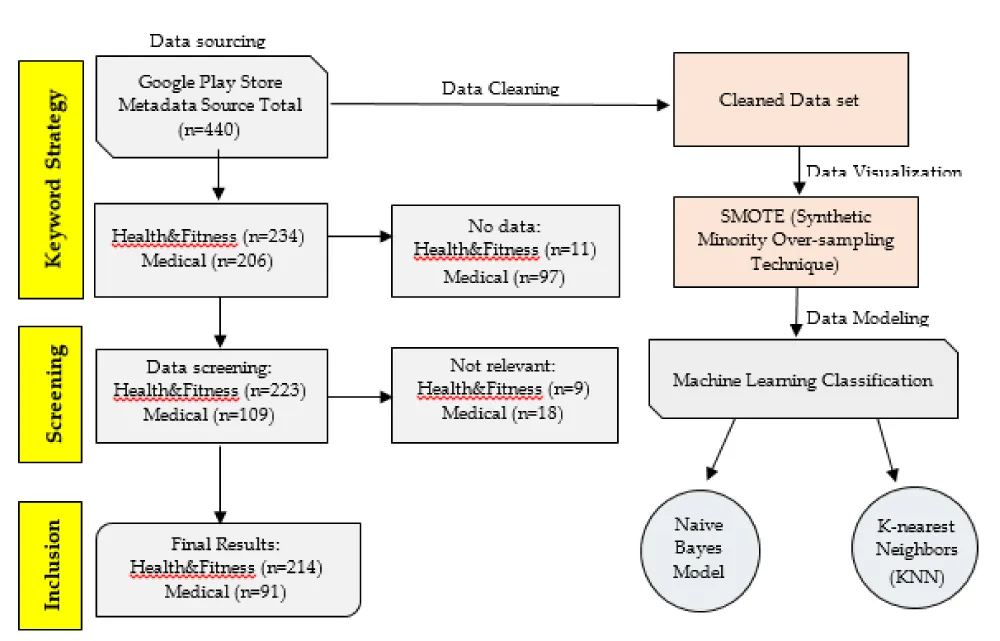 This study employed a novel combination of machine learning statistical techniques, including the Naïve Bayes Classifier and K-Nearest Neighbors (KNN). This hybrid methodology enables the analysis and classification of Google Play Store metadata, offering a multidimensional perspective on the effectiveness of healthcare applications based on user ratings.